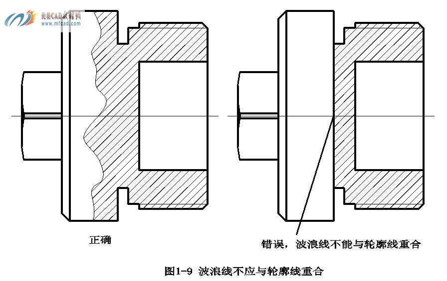 (1)表示剖切范围的波浪线或双折线不应与图样中的其他图线重合,如图1-9及1-10所示。