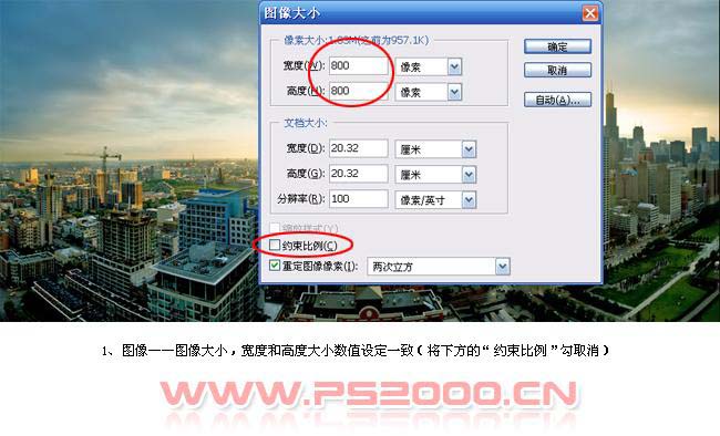 1、打开原图素材,选择菜单:图像 > 图像大小,把宽度和高度数值设定为一致,设定之前先把约束比例取消勾选。