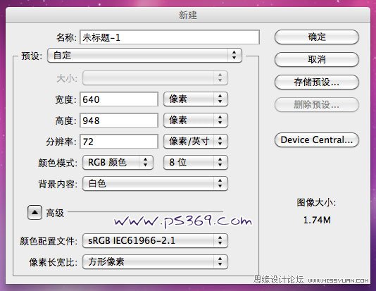 2、在PS中新建一个640X948像素的画布。
