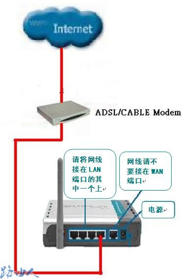 一、把对外线路或是从前端另一台D-LINK路由器接过来的网线接在LAN端口其中一个端口,而不要接在WAN