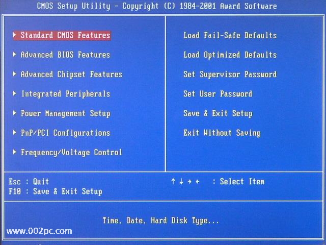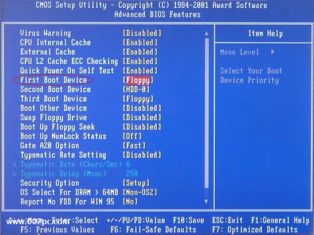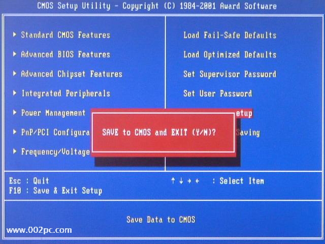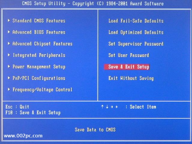 (上图中Floppy--软盘、HDD-0--硬盘、CDROM--光盘)然后按“向上或向下”箭头键,选择 “Floppy”项,接着按“Enter”回车键,即完成该项设置并重新返回了图4画面,你可以看到该项设置已经改变了。用同样的方法设置“Second Boot Device”项为“HDD-0”。设置完成后按“Esc”键退出到(图1)画面,然后按“向右、向下”键选“Save & Exit Setup”项,该项意思(保存设置并退出),如下图6(www.002pc.com)