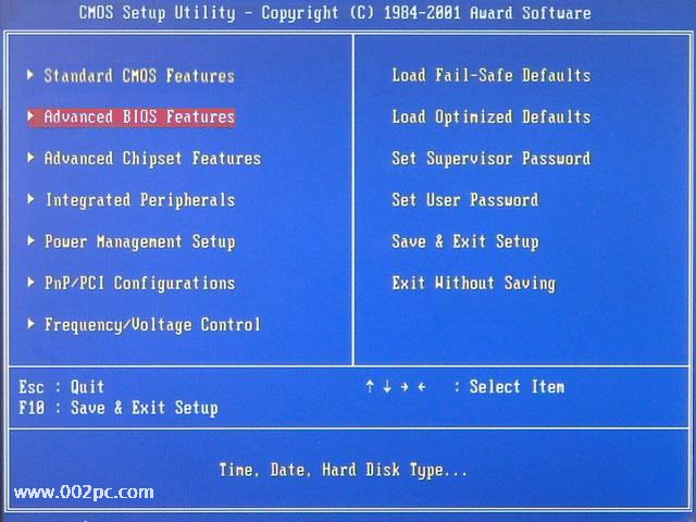 即进入了系统基础输入输出CMOS设置,在这里按“向下或向上”箭头键选择“Advanced BIOS Features”项。如下图3