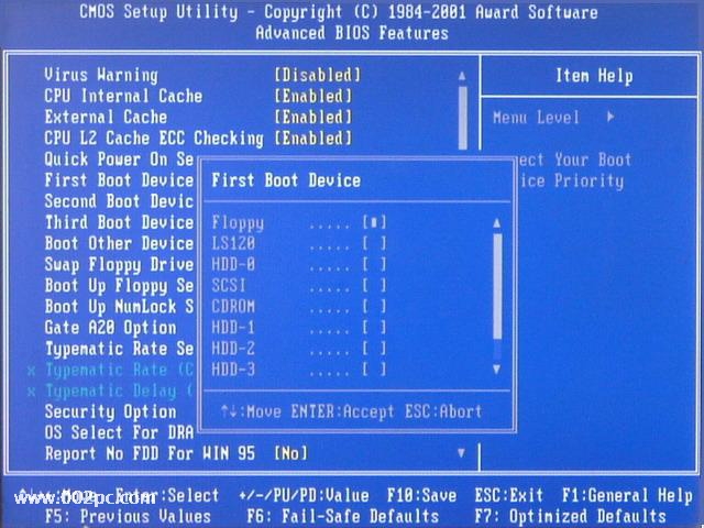 这里的“First Boot Device”项为设置第一启动盘项,“Second Boot Device”项为设置第二启动盘项,“Third Boot Device”项为设置第三启动盘项。 在这里我们将“First Boot Device”项设置为“Floppy”即软盘,"cdrom"就是光盘启动,现在安装系统一般都用光盘启动,“Second Boot Device”项设置为“HDD-0”即默认硬盘。设置方法∶选“First Boot Device”项按“Enter”回车键,出现如下 图5 所示