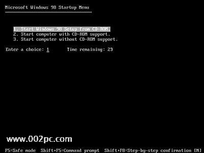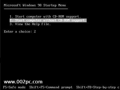 第一项“1. Start Windows 98 Setup from CD-ROM”(从光盘启动安装Windows 98系统) 第二项“2. Start computer without CD-ROM support”(加载光驱驱动程序进入DOS) 第三项“3. Start computer without CD-ROM support”(不加载光驱驱动程序进入DOS)