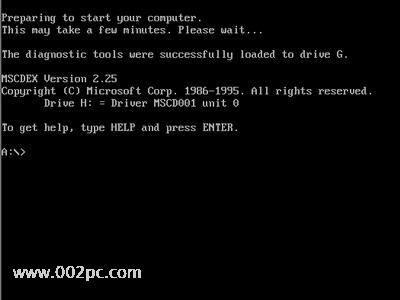 图8的启动选单中;第一项为∶启动时加载光驱驱动程序,第二项为∶启动时不加载光驱驱动程序,第三项为∶启动帮助。如果你不选择,系统在30秒后默认启动第一项。用“向下或向上”箭头选择键选择第二项“Start conputer without CD-ROM tupport”项即不加载光驱驱动程序项。然后回车。即可顺利启动到纯DOS系统。将出现如下图9的画面,这时已完全进入。