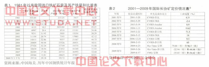 铁矿石是钢铁冶炼最主要的原材料,钢铁工业又是国民经济发展的基础产业。因此,铁矿石的稳定供应直接关系到钢铁工业的可持续发展和我国经济的健康运行。1981年我国进口矿产生铁占全国生铁产量的比重尚不到lO%,自1996年我国钢铁产量突破1亿吨后,进口矿的比重也快速提高,并于2004年超过50%,2009年上半年已经超过70%,如此高的依存度将严重影响我国钢铁工业的产业安全。