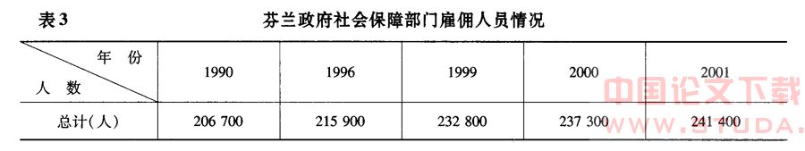 与其他欧美国家不同,北欧国家被视为服务型国家,它们提供福利更多的并非现金转付,而是提供服务,典型的例子是那些日托幼儿园和养老院,以及地方政府组织的照顾老人或病人的场所。北欧国家的这些社会福利部门雇佣了大量的劳动力,这与任何欧美国家相比都是一个相当高的比例。因此,北欧国家在社会、医疗和教育等公共部门的雇佣率最高,这些部门中大约90%的雇员由政府雇佣,形成对比的是在其他欧洲国家这一数字为40%~80%。北欧国家也由此开辟出一些新的工作领域,创造出大量就业机会。例如芬兰,在社会保障部门工作的人数逐年增长,2001年达到24万人以上(见表3)。瑞典中央一级劳动力市场委员会有工作人员1400多人,各城市共有325个就业办公室,工作人员7000多人。与财政资金以提供服务形式为主不同,像养老金、失业金等福利项目,则以提供资金为主,也有时适当地提供一些服务。