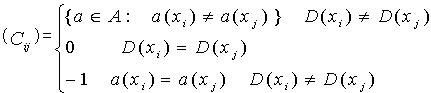 定义7:区分矩阵是华沙大学数学家Skowron[7]提出的,对于系统S=(U,A),其中A=C∪D, a(x)是x在属性a上的值,区分矩阵M为: