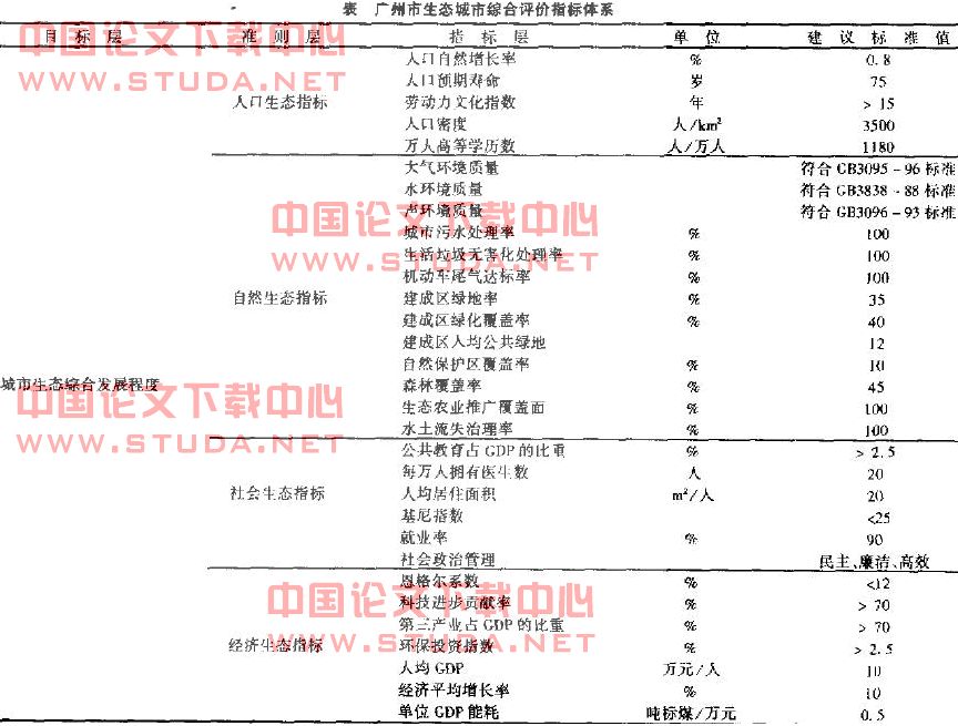 广州建设生态城市不能简单地理解为增加绿地、加强环境保护和治理的问题。从复合生态系统的观点来看,必须兼顾人口、社会、经济、自然系统各要素的协同发展,达到整体功能最佳。所以广州市生态城市建设标准、目标也应从这四个方面来确定。分定性和定量两部分定量指标的建议指示一个动态的指标值,在不同的发展阶段,指标指引作相应的调整。